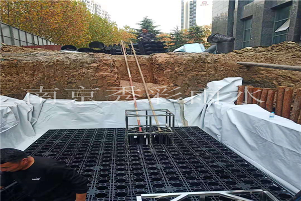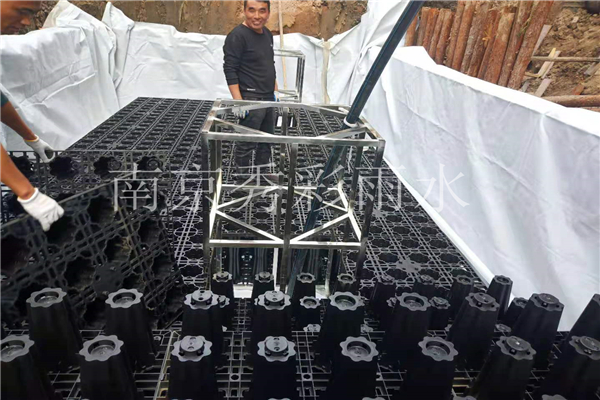 模塊的連接過程中,要盡量避免垂直連接,上下層之間應(yīng)該交叉式連接。先鋪設(shè)第1層,然后再逐層往上鋪設(shè)。在雨水供水裝置和雨水排泥裝置處安裝雨水模塊加固框架。若集水井中有水就必須保證一直抽水。