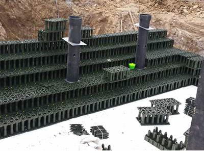 2、水池池體骨架是聚丙烯塑料注塑成型的雨水收集模塊體,配合使用不同的土工布包覆材料,可構成具有單一功能的PP模塊水池或兼有儲水和滲透雙重功能的滲透水池。
