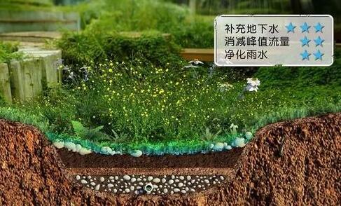 下凹式綠地集水通過草溝等形式收集場地中的徑流雨水,當雨水流過地表淺溝,污染物在過濾、滲透吸收及生物降解的聯合作用下被去除,植被同時也降低了雨水流速,使顆粒物得到沉淀,達到控制雨水徑流的目的。